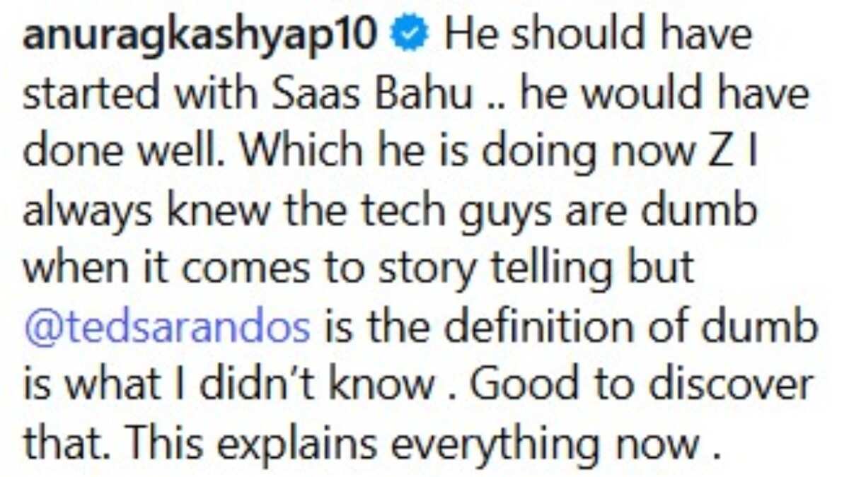 Kashyap, the director of Sacred Games, retorted that the Netflix co-CEO should have begun with saas bahu after Sarandos' remarks about the show went viral. He continued by saying that Sarandos is currently doing that (not clear if it was a jab at the Netflix partnership with Balaji or a general remark). Kashyap concluded his tweet by calling Sarandos "the definition of dumb" and simply writing, "Good to discover that." Now it all makes sense.
