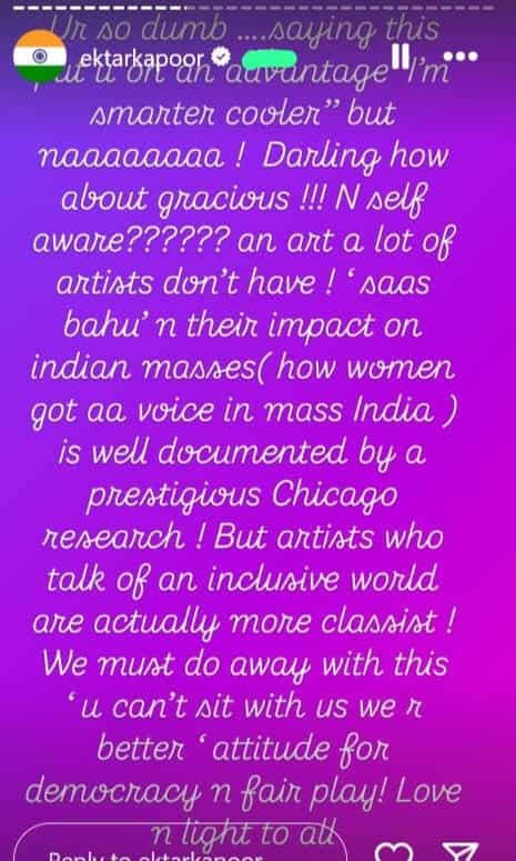 In the discussion, Ekta plainly singled out Kashyap for the "you're so dumb" remark while backing the Netflix CEO. She asked Kashyap if he thought he was more intelligent and cooler for using the term "dumb" to describe someone else and then said, "Darling, how about gracious!!! and self-aware?????? An art that a lot of artists don’t have!" The producer also defended the 'saas-bahu' remark by noting that Indian plays gave Indian women a voice. She attributed the same to Chicago research and said, "But artists who talk of an inclusive world are actually more classist. We must do away with this 'U can't sit with us, we're better' attitude for democracy and fair play! Love n light to all (sic)."